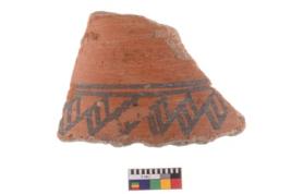 | Description / विवरण | A fragment of a potsherd. It is reddish in colour with black decorative geometric painting on it. |