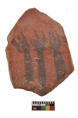 | Description / विवरण | Specimen of black on red ware with decorative potters mark Three hands painting. |