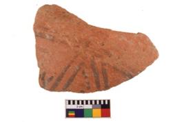 | Description / विवरण | A specimen of a potsherd. It is reddish in colour with black decorative geometric painting on it. |
