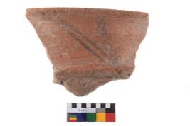 | Description / विवरण | A fragment of a potsherd. It is reddish in colour with black decorative geometric painting on it. |