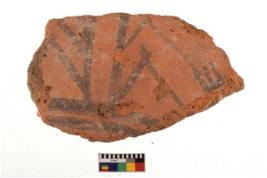 | Description / विवरण | A specimen of a potsherd. It is reddish in colour with black decorative geometric painting on it. |