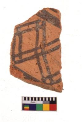 | Description / विवरण | A specimen of a potsherd. It is reddish in colour with black decorative geometric painting on it. |