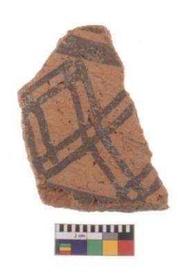 | Description / विवरण | Specimen of black on red ware with black decorative Lattice pattern geometric painting. |