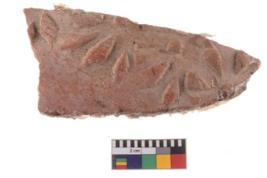 | Description / विवरण | A fragment of a potsherd. It is reddish in colour with stamped decorative geometric painting on it. |