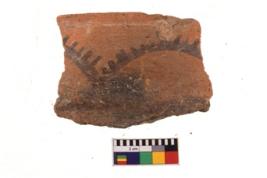 | Description / विवरण | A specimen of a potsherd. It is reddish in colour with black decorative geometric painting on it. |