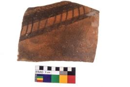 | Description / विवरण | Specimen of potsherd black on red painted pottery. It is fine fabric in sharp contrast with painted design are executed in black pigment. |