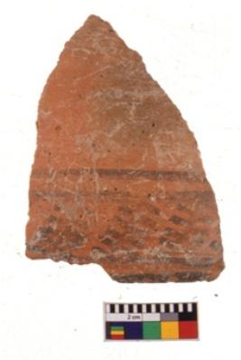 | Description / विवरण | A specimen of a potsherd. It is reddish in colour with black decorative geometric painting on it. |