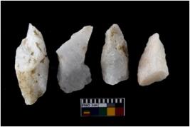 | Description / विवरण | There are n-4 of intact flake cores made up of Quartz. Some of them have bulge of percussion and some are flat flakes. |