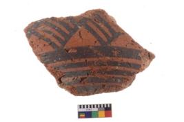 | Description / विवरण | A fragment of a potsherd. It is reddish in colour with black decorative geometric painting on it. |