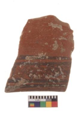 | Description / विवरण | Specimen of black on red ware with black decorative Lattice pattern geometric painting. |