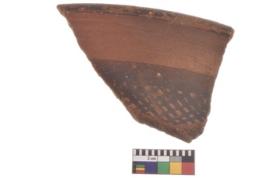 | Description / विवरण | Specimen of black on red ware with decorative geometric Two horizontal bands containing criss-cross pattern painting. |