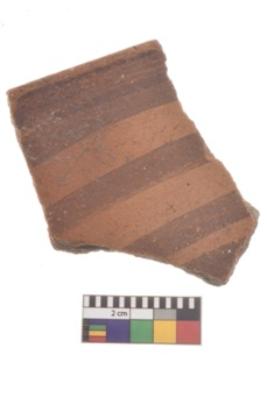 | Description / विवरण | Specimen of black on red ware with decorative geometric parallel lines painting. |
