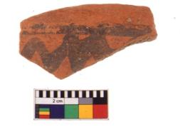 | Description / विवरण | A specimen of a potsherd. It is reddish in colour with black decorative geometric painting on it. |