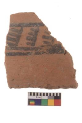 | Description / विवरण | Specimen of black on red ware with black decorative Parallel cross spike lines geometric painting. |