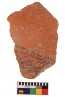 | Description / विवरण | A specimen of a potsherd. It is reddish in colour with black decorative geometric painting on it. |