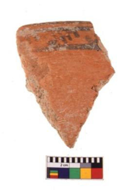 | Description / विवरण | A specimen of a potsherd. It is reddish in colour with black decorative geometric painting on it. |