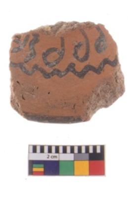 | Description / विवरण | A fragment of a potsherd. It is reddish in colour with black decorative bunting painting on it. |