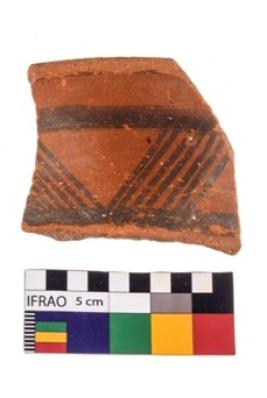 | Description / विवरण | Specimen of potsherd black on red painted pottery. It is fine fabric in sharp contrast with painted design are executed in black pigment. |