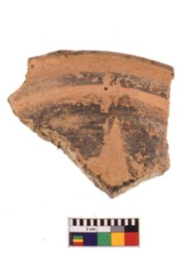 | Description / विवरण | A specimen of a potsherd. It is reddish in colour with black decorative geometric painting on it. |