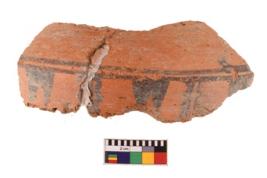 | Description / विवरण | A specimen of a potsherd. It is reddish in colour with black decorative geometric painting on it. |