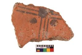 | Description / विवरण | A specimen of a potsherd. It is reddish in colour with black decorative geometric painting on it. |