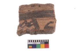 | Description / विवरण | A fragment of a potsherd. It is reddish in colour with black decorative geometric painting on it. |