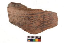 | Description / विवरण | A specimen of a potsherd. It is reddish in colour with black decorative geometric painting on it. |