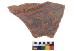| Description / विवरण | A fragment of a potsherd. It is reddish in colour with black decorative geometric painting on it. |