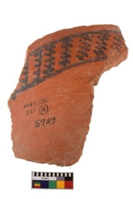 | Description / विवरण | A specimen of a potsherd. It is reddish in colour with black decorative geometric painting on it. |