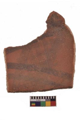 | Description / विवरण | Specimen of black on red ware with decorative geometric Two horizontal bands containing criss-cross pattern painting. |