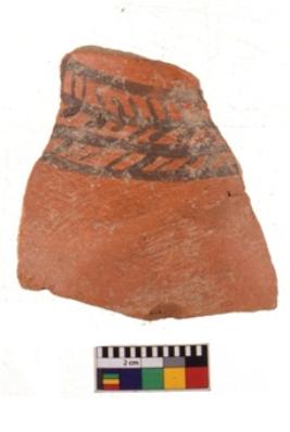 | Description / विवरण | A specimen of a potsherd. It is reddish in colour with black decorative geometric painting on it. |