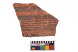 | Description / विवरण | Specimen of black on red ware with decorative geometric parallel lines painting. |