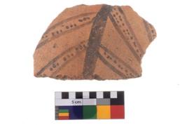 | Description / विवरण | A fragment of a potsherd. It is reddish in colour with black decorative a plant painting on it. |