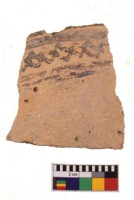 | Description / विवरण | A specimen of a potsherd. It is reddish in colour with black decorative geometric painting on it. |