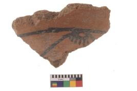 | Description / विवरण | Specimen of black on red ware with black decorative Joint curves and sun motif nature and geometric painting. |