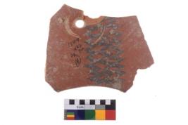 | Description / विवरण | A fragment of a potsherd. It is reddish in colour with black decorative Zig zag painting with perforated on it. |