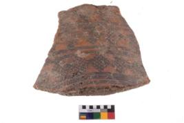 | Description / विवरण | A fragment of a potsherd. It is reddish in colour with black decorative geometric painting on it. |