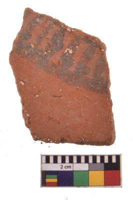 | Description / विवरण | Specimen of black on red ware with decorative geometric Vertical strokes set in two horizontal bands painting. |