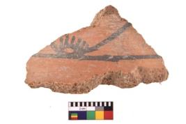 | Description / विवरण | A specimen of a potsherd. It is reddish in colour with black decorative geometric painting on it. |