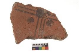 | Description / विवरण | Specimen of black on red ware with black decorative Intersecting parallel lines with dots on intersection geometric painting. |
