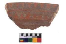 | Description / विवरण | A fragment of a potsherd. It is reddish in colour with black decorative geometric painting on it. |