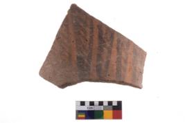 | Description / विवरण | A fragment of a potsherd. It is reddish in colour with black decorative geometric painting on it. |