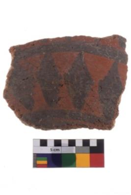 | Description / विवरण | A fragment of a potsherd. It is reddish in colour with black decorative geometric painting on it. |