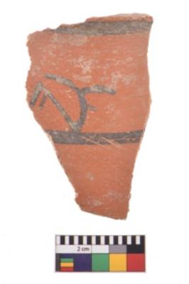 | Description / विवरण | A specimen of a potsherd. It is reddish in colour with black decorative geometric painting on it. |