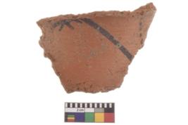 | Description / विवरण | Specimen of black on red ware with decorative geometric Doted lines and one vertical line and sun motif painting. |