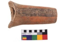 | Description / विवरण | A broken spout of a Redware It is reddish in colour with black decorative geometric painting on it. |