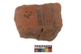 | Description / विवरण | Specimen of black on red ware with black decorative Parallel wavy and straight lines geometric painting. |