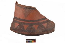 | Description / विवरण | Specimen of black on red ware with decorative geometric Latticed loops set in two horizontal bands painting. |