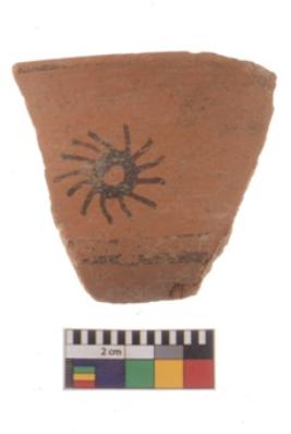 | Description / विवरण | Specimen of black on red ware with black decorative Sun motif nature painting. |