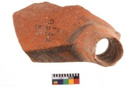 | Description / विवरण | A broken spout of a Redware It is reddish in colour with black decorative geometric painting on its base of spout. |